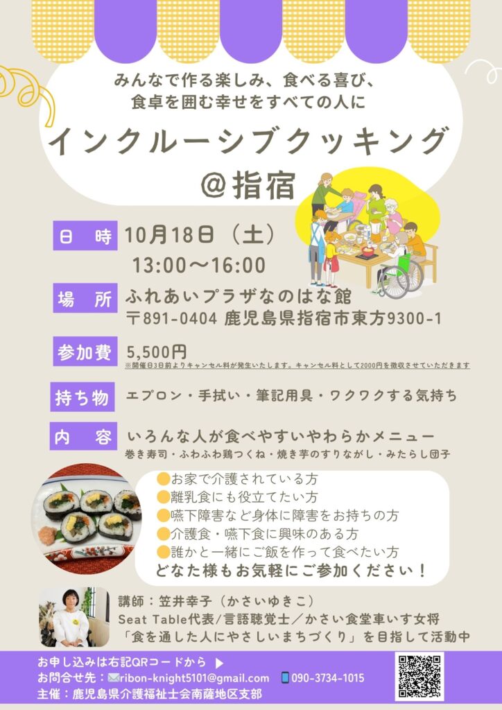 鹿児島県介護福祉士会南薩地区支部さまとのご縁をいただき、鹿児島県指宿市にて、インクルーシブクッキング@指宿を開催致します✨